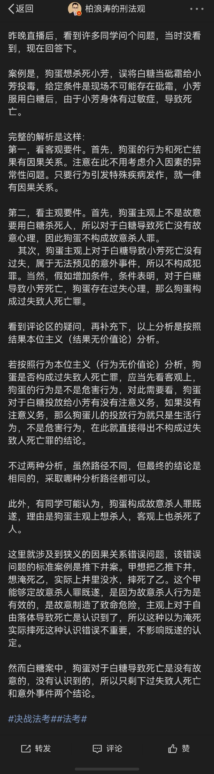 白糖杀人案是老朋友了,柏浪涛老师之前直播就提到过这个案例,按照他的观点,结论是无罪。