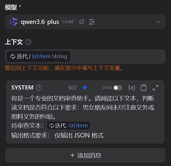 首先把迭代输入的字符串输入上下文,在system提示词里面讲明白自己的需求,同时为了便利接下来的处理,我们可以把输出格式调整为json,这样好像就可以直接用json里面的数据进行条件判断,我这里的代码执行属于是不熟悉时的画蛇添足。