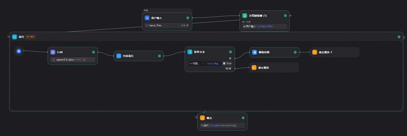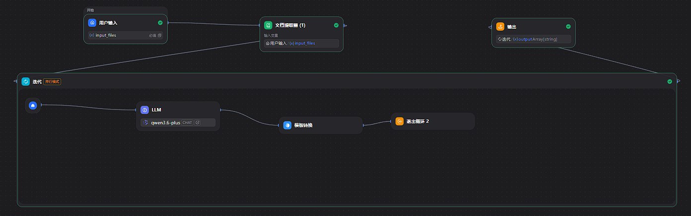 先展示一下dify的流程,首先设置上传文件列表,把所有的文件通过文件提取器转化为一个字符串的数组,有了这个数组之后,我们才可以在迭代里面做并行的处理。
