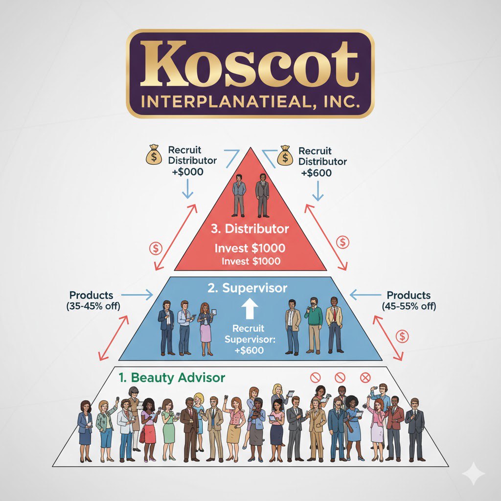 Koscot Interplanetary, Inc.(下称Koscot公司)这家公司的模式,一言以蔽之,就是传销。关于Koscot公司如何培训自己的员工和分销商拉人头此处略过不提,大致一讲公司的架构。